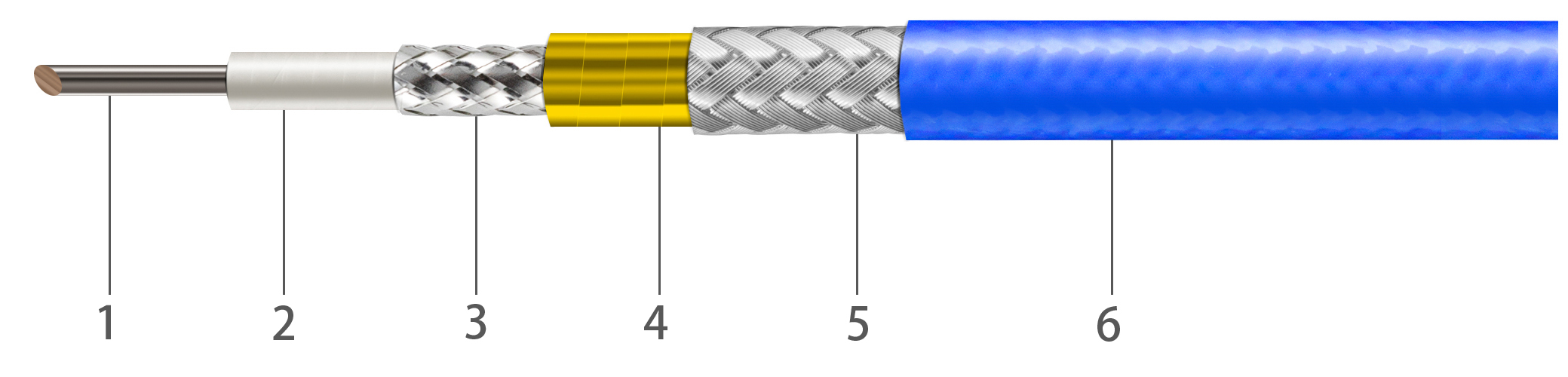 1.中(zhong)心導體/銅鍍銀(單(dān)芯或多芯) 2.介質層(ceng)/低密度PTFE 3.内層屏蔽(bi)/鍍銀銅帶繞包 4.中(zhong)間層/PTFE包覆 5.外編織(zhi)層/鍍銀銅絲 6.外護(hu)套/藍色FEP |