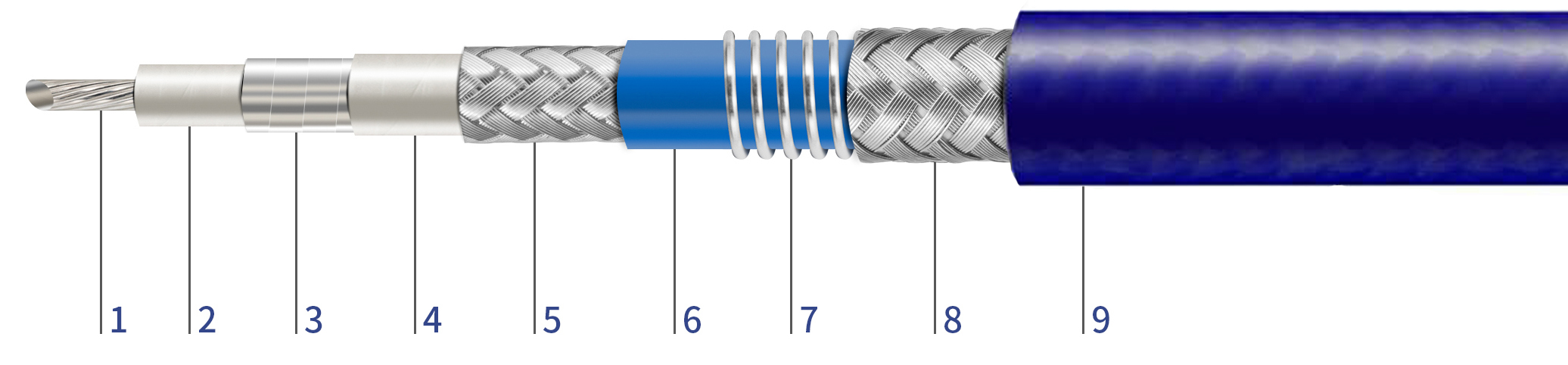 1.中心導體/銅鍍(dù)銀(單芯或多芯) 2.介(jiè)質層/低密度PTFE 3.内層(céng)屏蔽/鍍銀銅帶繞(rao)包 4.中間層/PTFE包覆 5.外(wai)編織層/鍍銀銅絲(si) 6.外護套/藍色FEP 7.彈簧(huáng)結構/不鏽鋼絲 8.外(wài)編織層/鍍銀銅絲(sī) 9.外護套/藍色PUR |