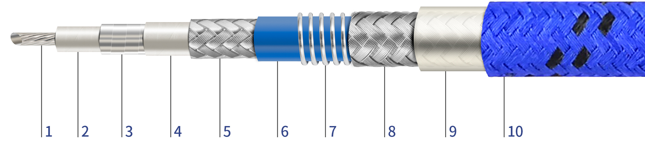 1.Center Conductor/Silver Plated Copper(Solid or Stranded) 2.Dielectric/Low Density PTFE 3.Inner Shield/Silver Plated Copper Tape 4.Interlayer/PTFE, Wrapped 6.Inner Jacket/Blue,FEP 7.Spring Member/Stainless Steel Wire 8.Outer Braid/Silver Plated Copper Wires 9.Waterproof Layer/PI+PTFE 10.Outer Jacket/PTFE Wire, Blue |