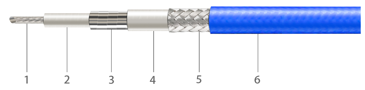 1.Center Conductor/Silver Plated Copper(Solid or Stranded) 2.Dielectric/Low Density PTFE 3.Inner Shield /Silver Plated Copper Tape 5.Outer Braid/Silver Plated Copper Wires 6.Outer Jacket/Blue FEP |