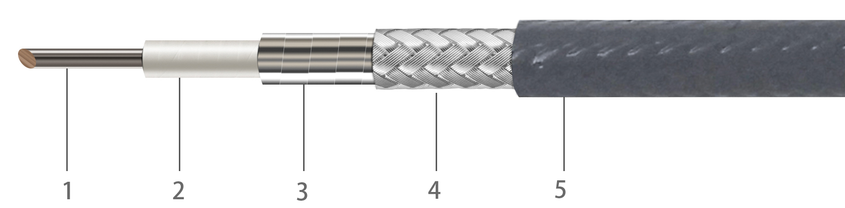 1.Center Conductor/Silver Plated Copper(Solid) 3.Inner Shield /Silver Plated Copper Tape 4.Outer Braid/Silver Plated Copper Wires 5.Outer Jacket/Gray PFA |